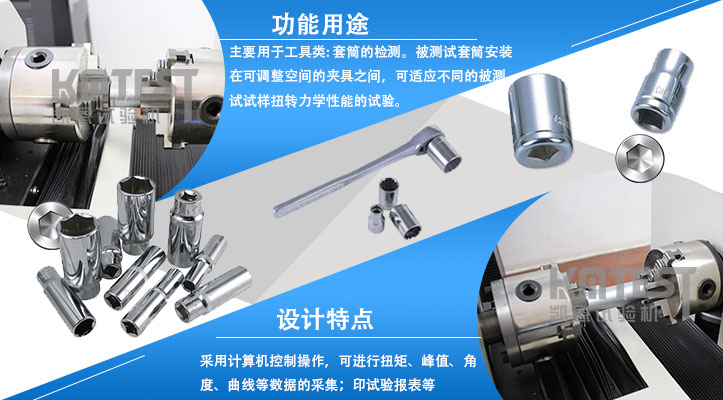 套筒扭轉(zhuǎn)試驗機主要用于工具類: 套筒的檢測。被測試套筒安裝在可調(diào)整空間的夾具之間,可適應(yīng)不同的被測試試樣扭轉(zhuǎn)力學(xué)性能的試驗。套筒扭轉(zhuǎn)試驗機采用計算機控制操作,可進行扭矩、峰值、角度、曲線等數(shù)據(jù)的采集;顯示器顯示被測試套筒的扭矩-時間,扭矩-扭角和扭矩-轉(zhuǎn)角試驗曲線;可以實現(xiàn)試驗數(shù)據(jù)存儲、考取、打印試驗報表等。